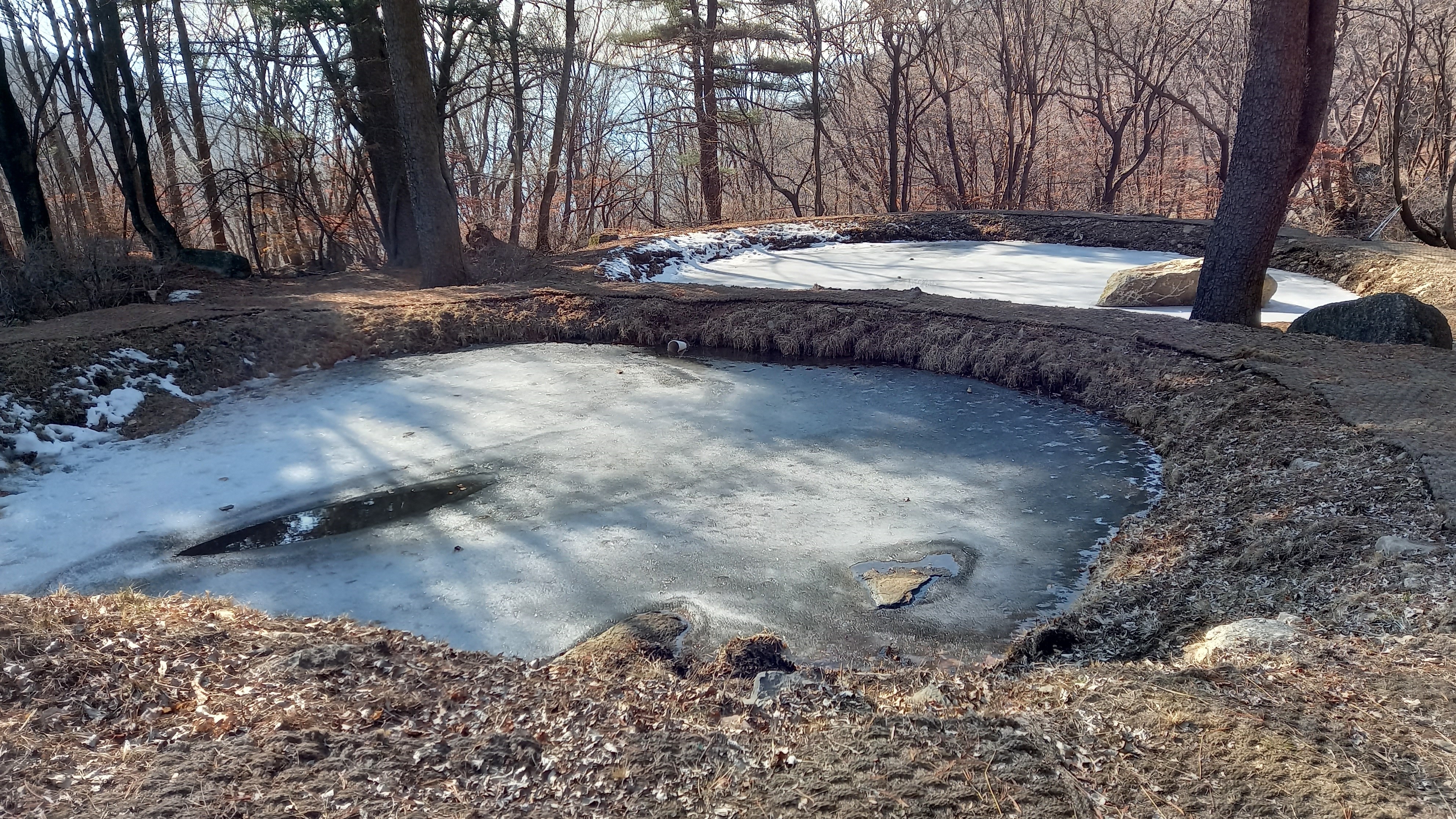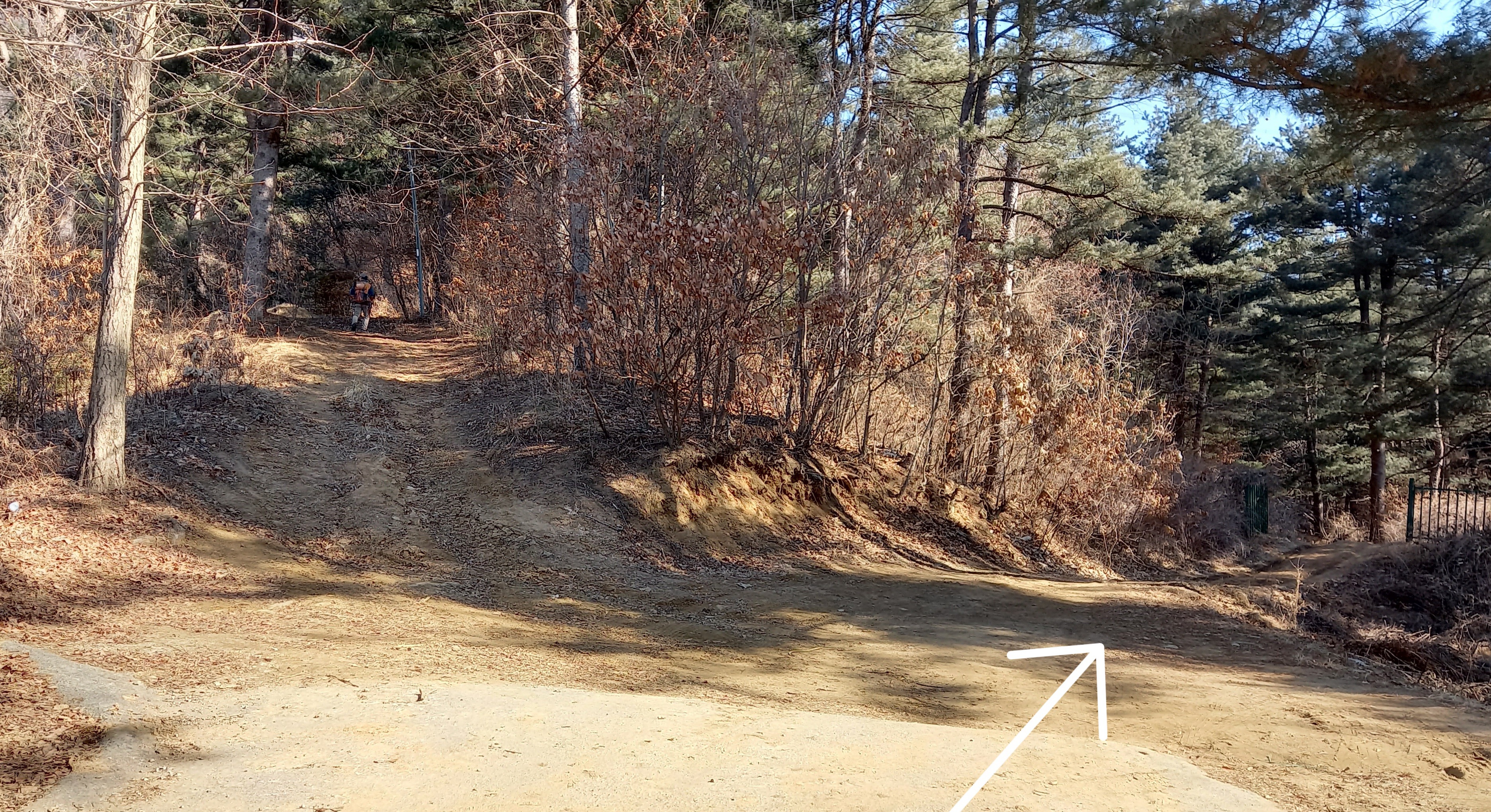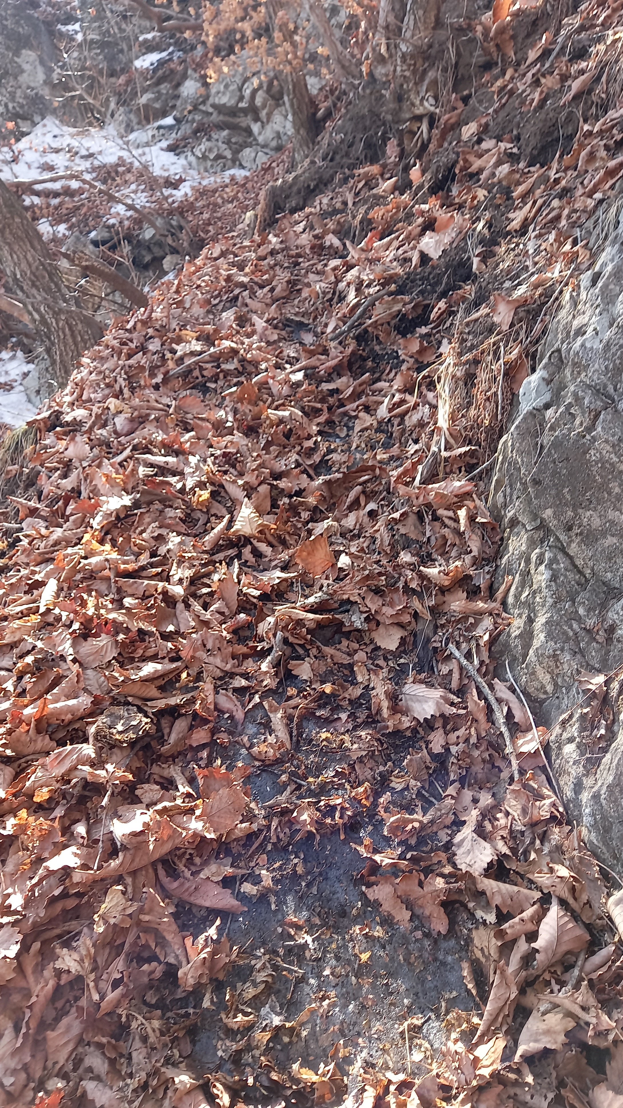 경사진 응달 쪽 낙엽 아래 길은 얼음입니다: