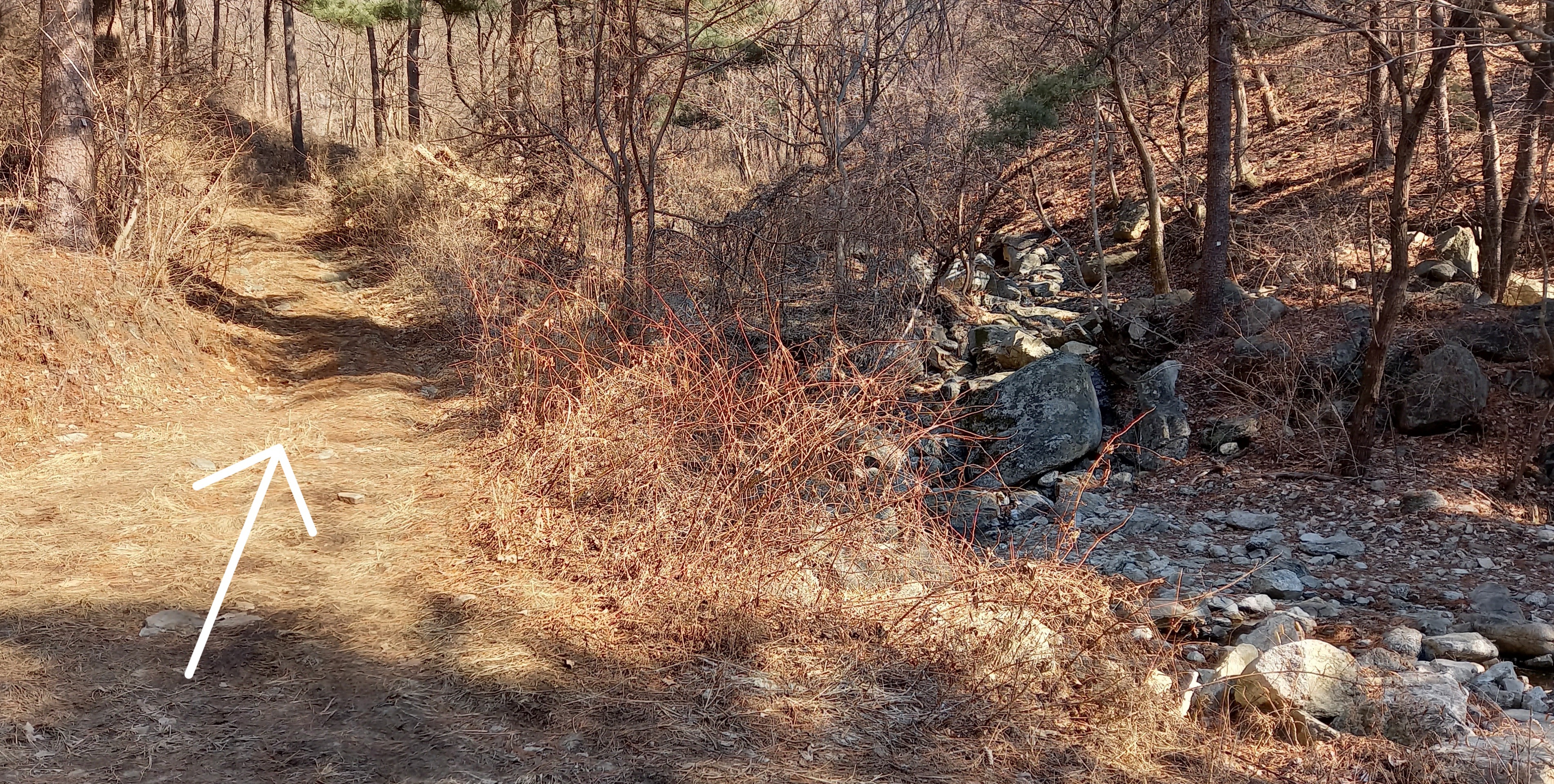 개울 넘기전 길이 좁아지는 좌측 수래넘어골 길로: