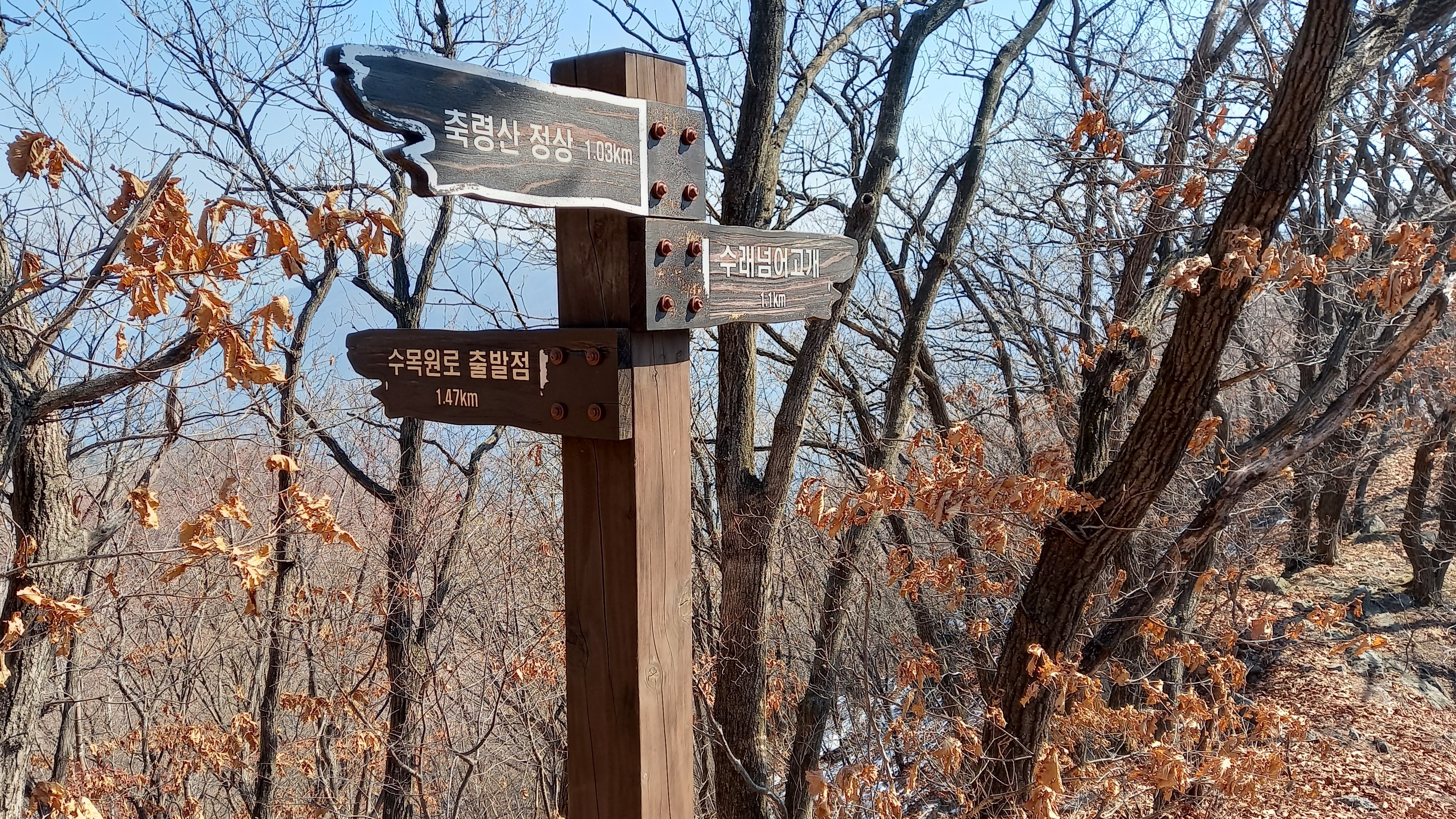 정상 1.03km, 수래넘어고개 1.1km, 수목원로 출발점 1.47km 이정표를 만나고서야 수레넘어고개를 빗겨 지나쳐 오른 것을 알았습니다. 수목원로 이정표 방향표시는 있는데 길은 도무지 보이지 않습니다(거의 죽은 길):