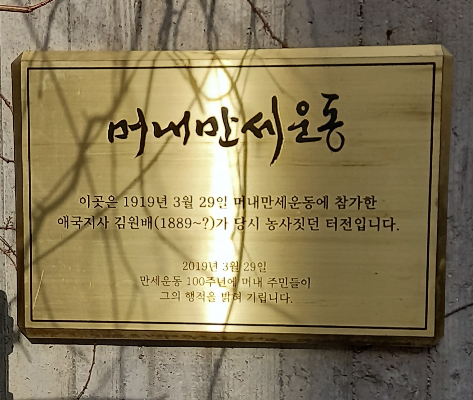 1919년 머내 만세운동 참가자 김원배(金元培 1889~?) 지사를 기리는 기념표지판이 느티나무도서관 외벽에 있습니다. 느티나무도서관 터는 김원배 지사가 손수 농사지은 밭이었습니다. 태형 90대의 혹독한 매질을 당한 김원배 지사는 별세 년도조차 미상이고 후손들도 모두 마을을 떠났지만 느티나무도서관 외벽에 표지판 설치로 더 이상은 잊히지 않게 되었습니다.