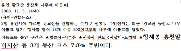 저 자신 처음에는 정평공원이 심방산의 전부인 줄 알고 정평공원(134m)을 산책하다, 아니! 이렇게 작은 동산에 조선 조정(朝廷)의 사자(使者)가 찾아왔을 때 어디 숨을 곳이나 있었을가? 하는 의문이 들었습니다. 인근 이마트 옥상에 올라 주변 지형을 살펴보고 ‘수지로’ 건너편 신봉근린공원(172m)을 올라 현장을 발로 확인하게 되었습니다.