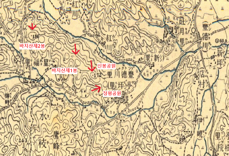 ↓ 국토지리정보원 1910·1930년 지도<172봉(현, 신봉공원 정상)이 심방산 정상>: