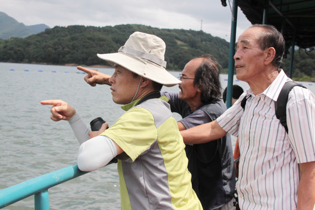 ▲ 군북면 용호리를 향한 배 위에서 본사 이안재 대표와 석호리의 어부 손학수씨, 정수병씨(사진 왼쪽부터)가 주변을 둘러보며 수몰 전의 모습에 대해 이야기하고 있다.
