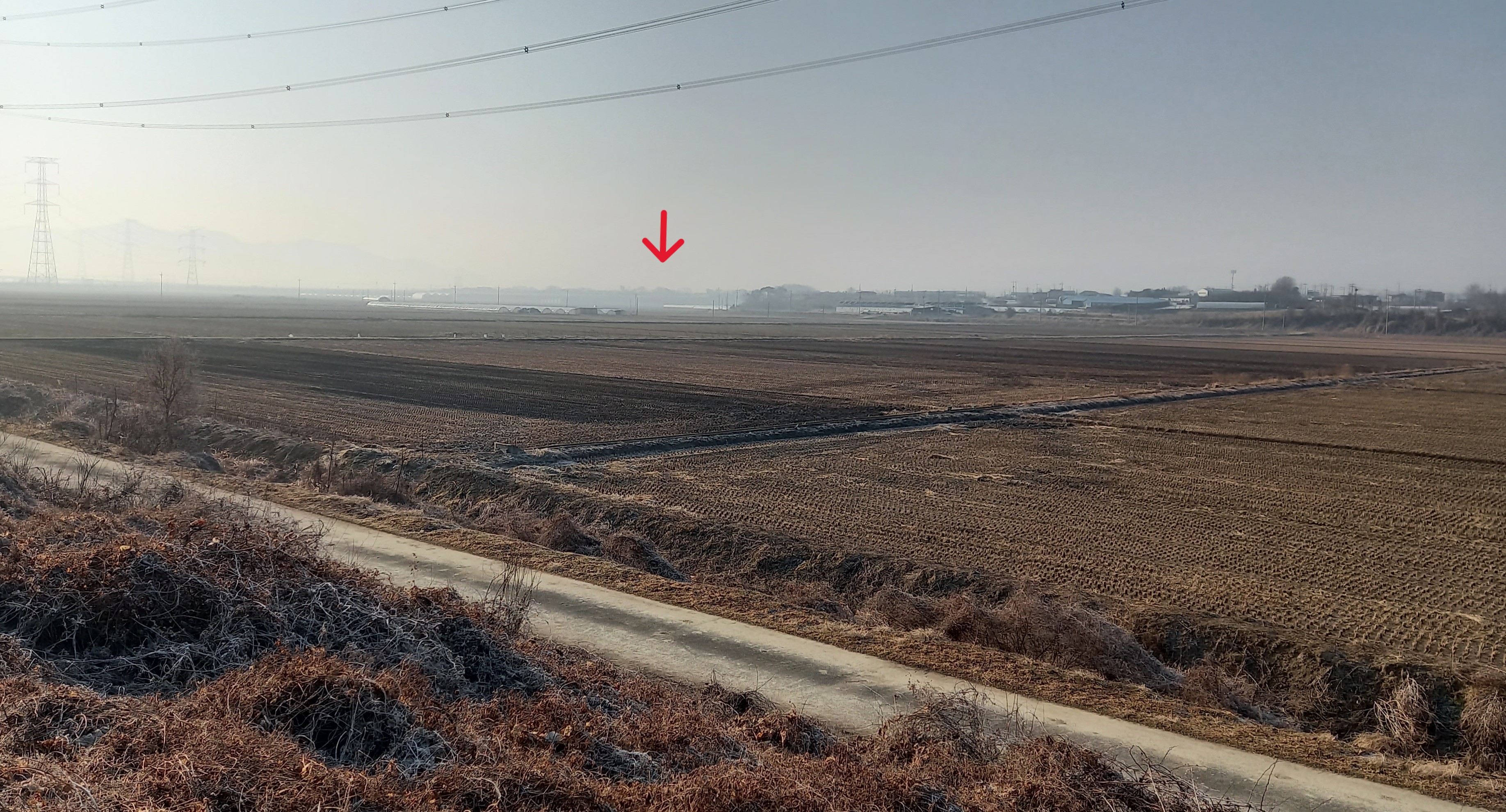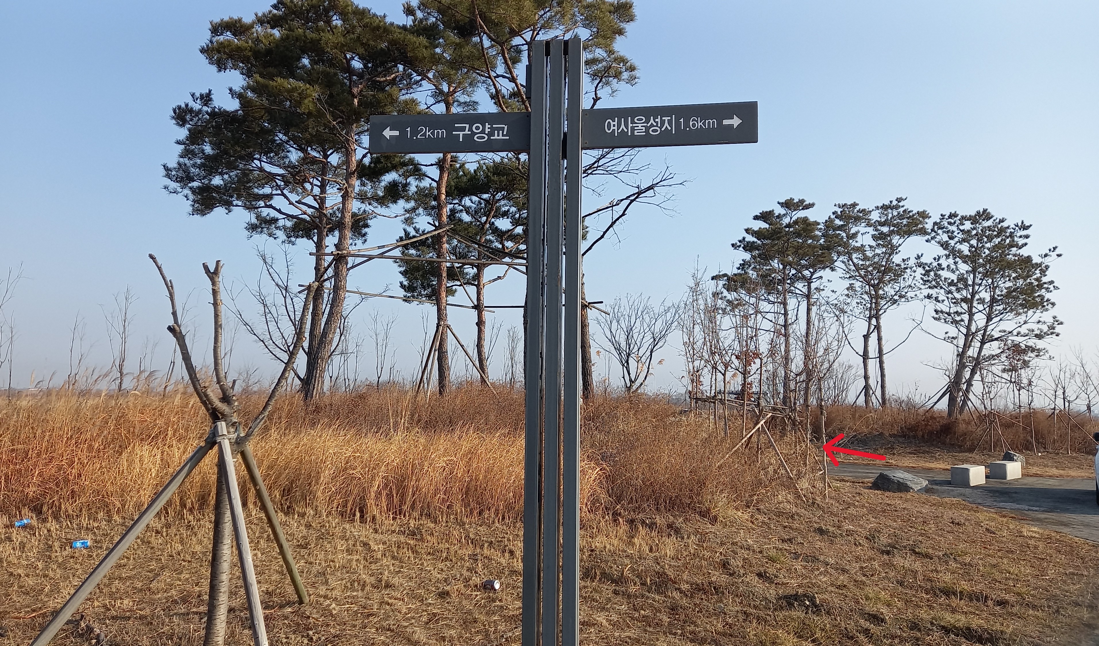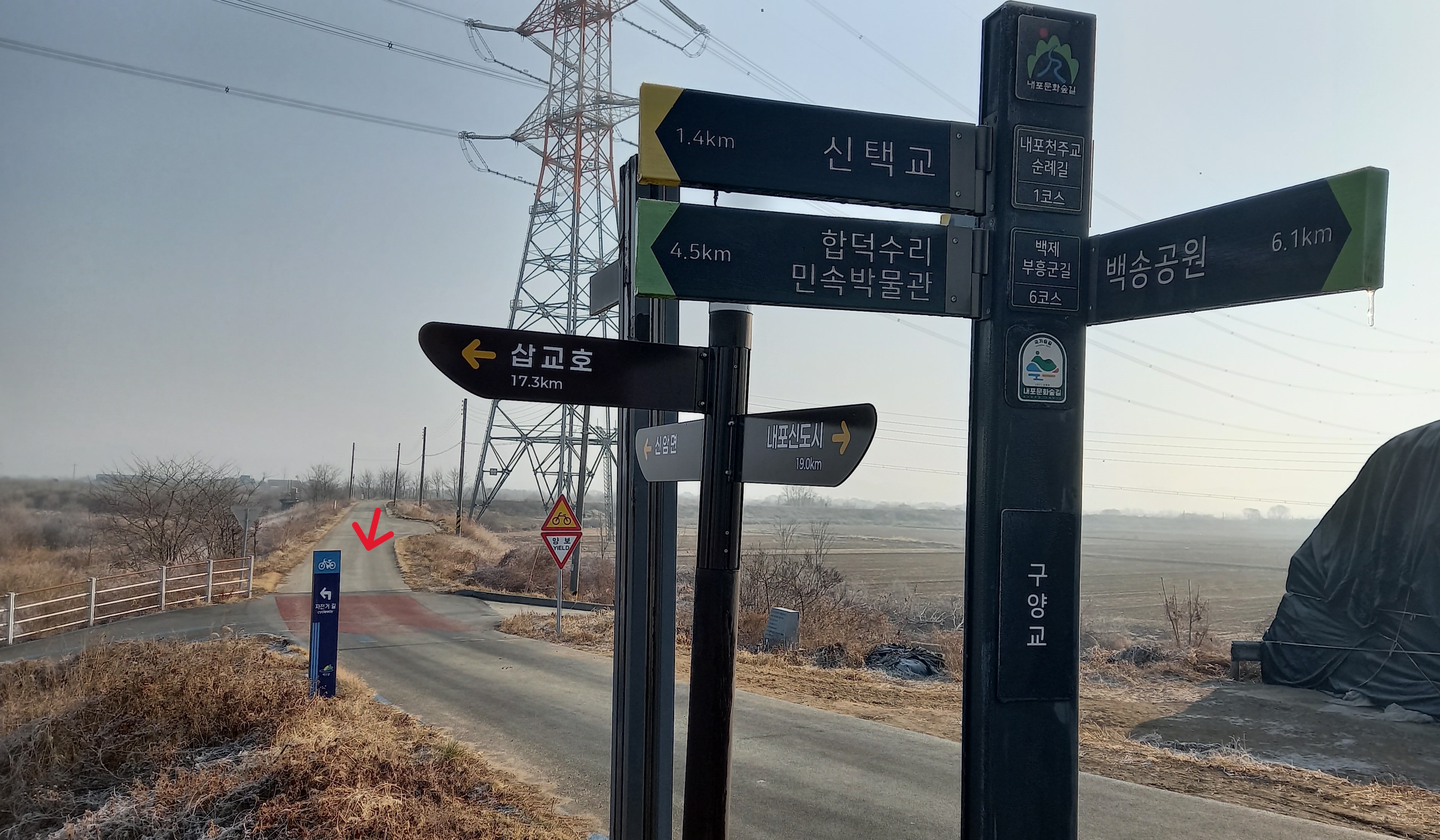 여사울 성지 1.7km, 신리성지 6.8km 지점 뚝방. 화살표는 들판 질러온 경운기 길: