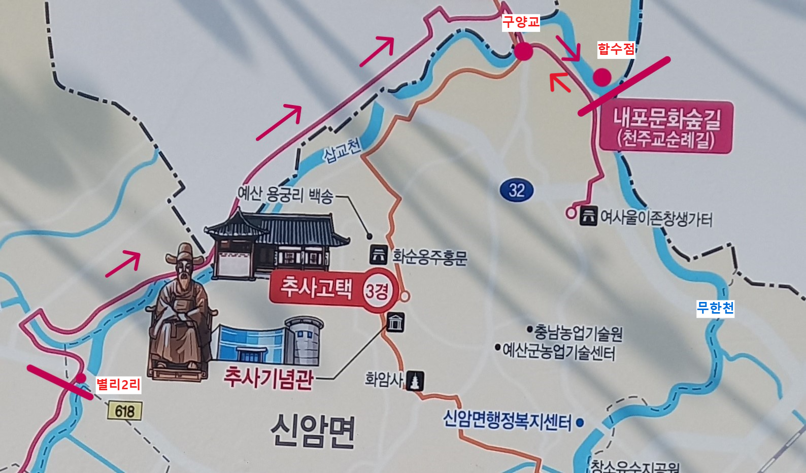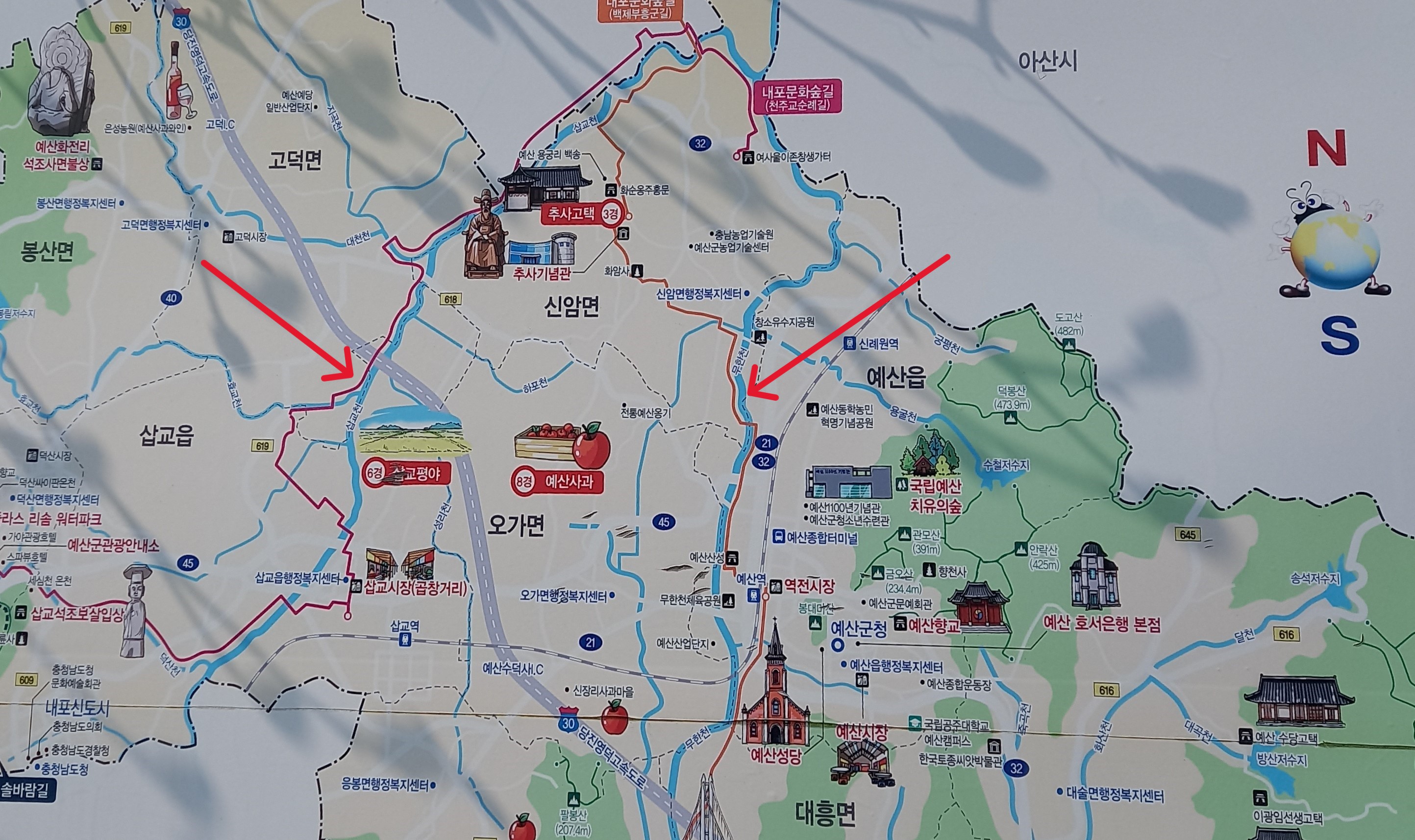 예산군 관광지도. 화살표 좌(삽교천), 우(무한천):